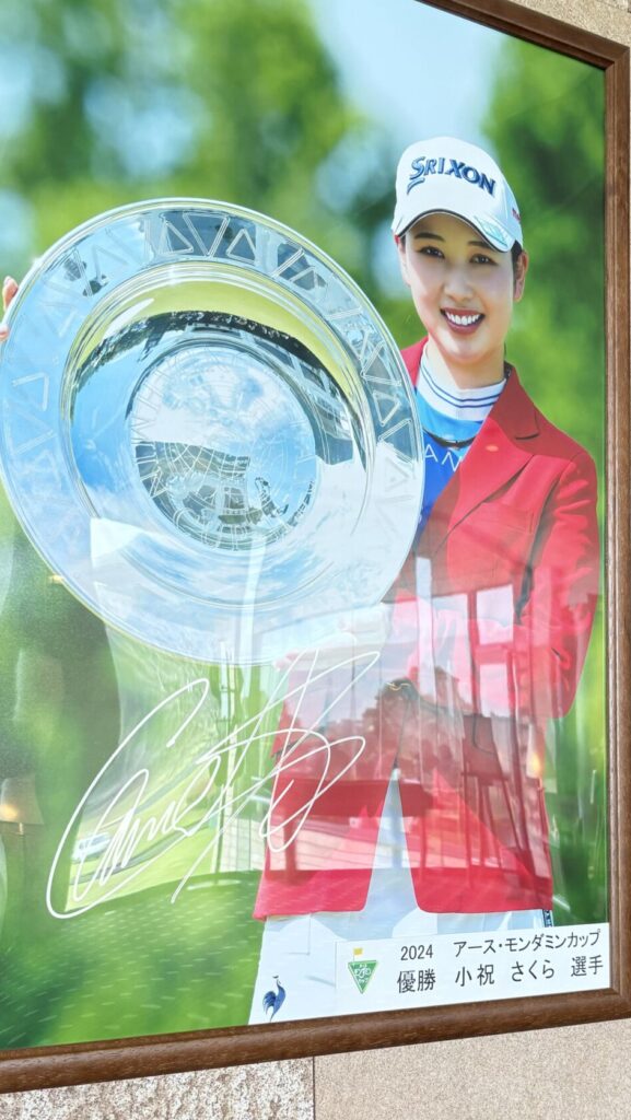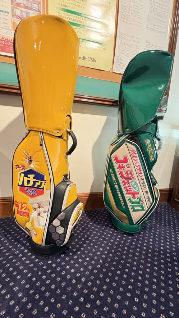クラブハウスには、2024年大会優勝の小岩井さくら選手はじめ歴代優勝者の写真やアース製薬にちなんだ殺虫スプレーモチーフのキャディバッグなどが飾ってありました。